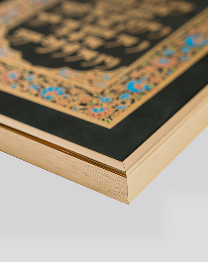 The Mool Mantra framed with 24-carat gold detailing on rich black velvet a timeless keepsake symbolizing purity and divine protection.